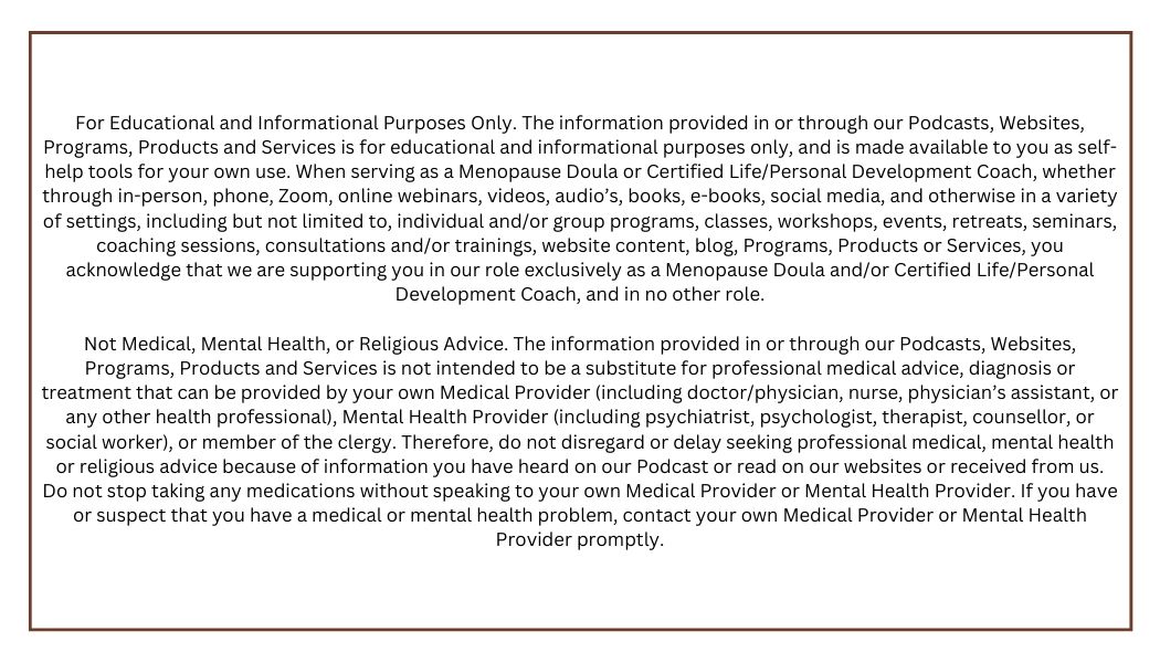As your menopause doula, my role is to be a warm and supportive presence during this transformative phase. We'll work together to create a personalized menopause toolkit tailored to your specific needs, covering information about hormonal changes, dietary and exercise recommendations, and relaxation techniques.